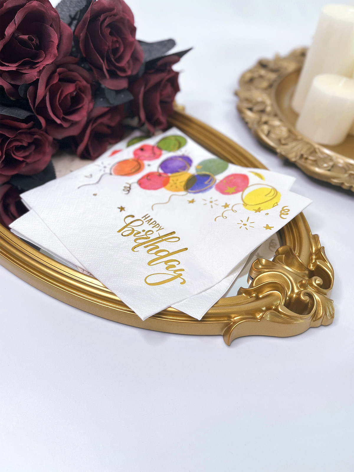 Papirservietter utsmykket med gullfolie "gratulerer med dagen" og fargerike ballonger vil utfylle drikkevarer, cocktailer, kakekopper og desserter, og heve den generelle servisepresentasjonen.